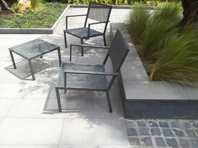 L’intervento riguarda la progettazione di 2 giardini all’interno di un complesso storico risalente al XVI sec. circa. Si tratta di un complesso di casali dove si trovavano le prigioni pontificie, per questo denominato “Le Galere”. I materiali utilizzati sono in parte già presenti nel contesto: sampietrini e lastre di basalto, disposte sia come pavimentazione in orizzontale, sia in verticale per i cigli, sia per creare sedute. Il giardino “pubblico” , che si apre sulla zona giorno della casa è fortemente caratterizzato dalla presenza di 3 olivi secolari, illuminati da faretti direzionali, e una grande pergola in alluminio, dove si arrampica il glicine. Nel giardino “privato” invece , sulla zona notte, sono stati inseriti solo alberi da frutto e tappezzanti. In entrambi i casi i percorsi sono illuminati da lampade a terra molto suggestive.
